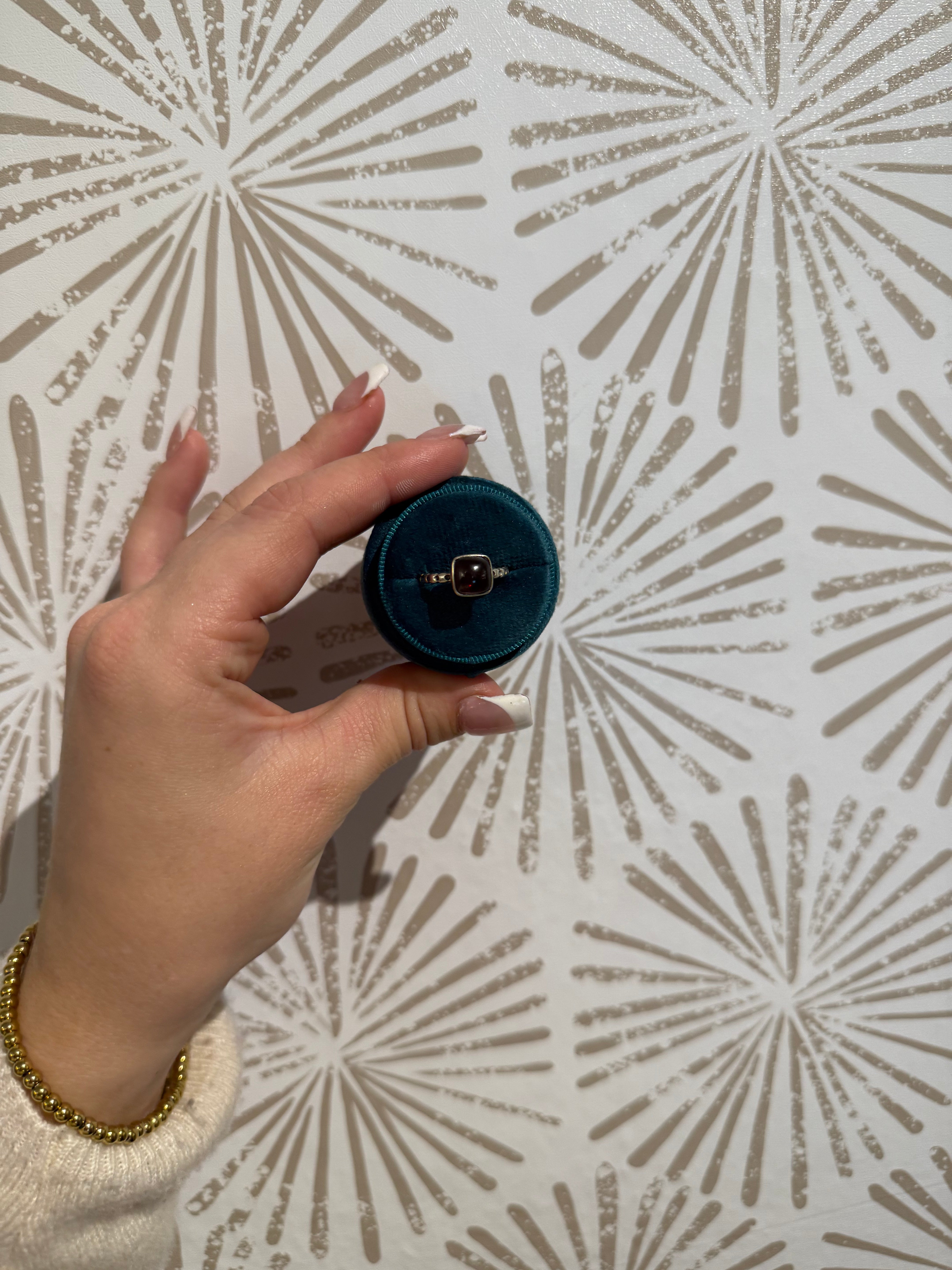 Rich in color, timeless in design—the Red Garnet Ring captures a sense of quiet strength and enduring beauty. Centered around a deep red, square-cut garnet cabochon, this ring radiates warmth and sophistication. The gemstone’s smooth, domed surface glows with an inner fire, reflecting shades of crimson and wine as it catches the light. Set in a finely detailed dotted sterling silver band, the ring combines old-world craftsmanship with contemporary simplicity, resulting in a piece that feels both classic and distinctly modern.