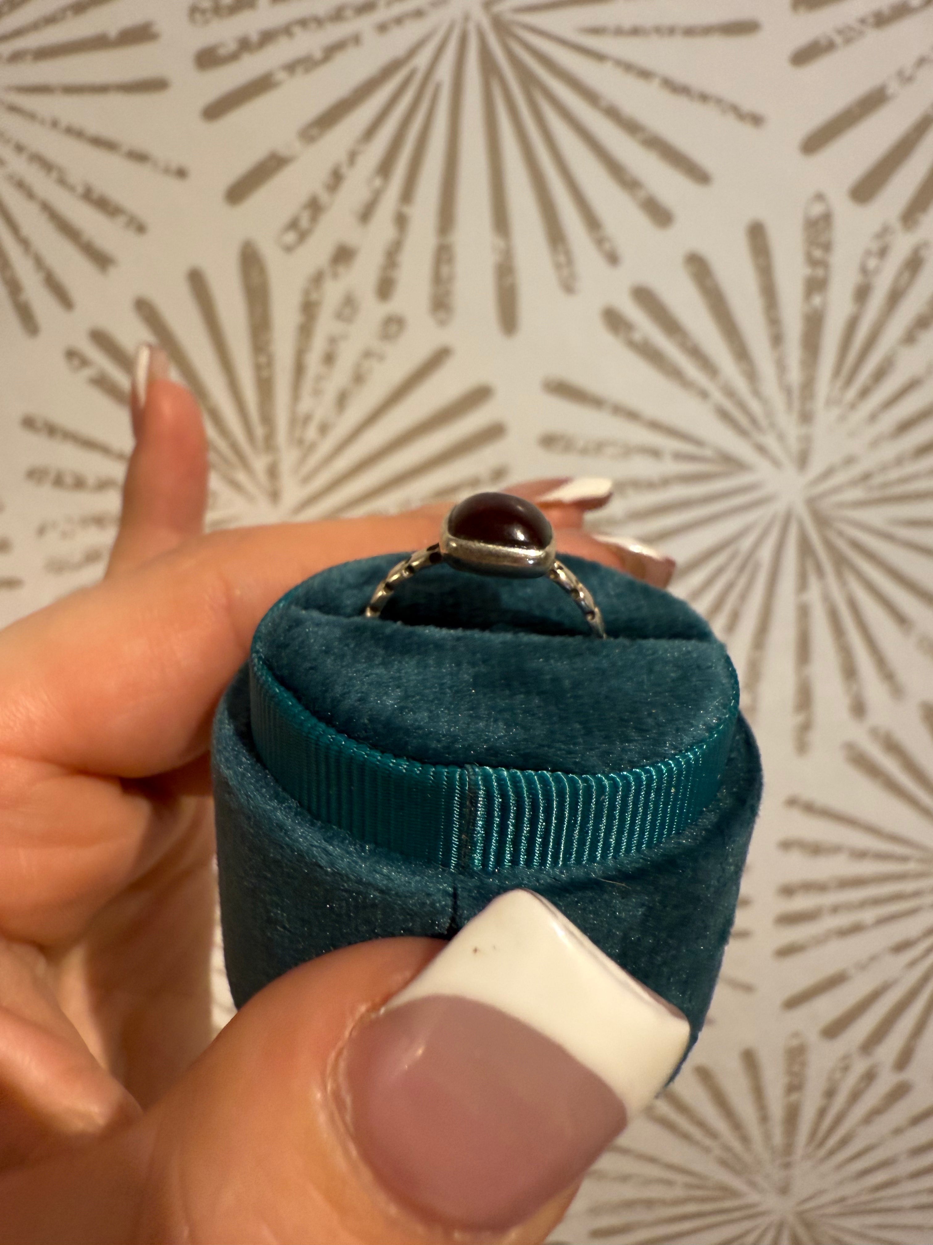 The Red Garnet Cabochon Sterling Silver Ring is a celebration of refined artistry and natural beauty. With its bold gemstone, intricate dotted band, and luminous silver craftsmanship, it embodies elegance and emotion in perfect harmony. Each glance reveals something new—the glow of the garnet, the shimmer of silver, the quiet confidence of a truly timeless design.