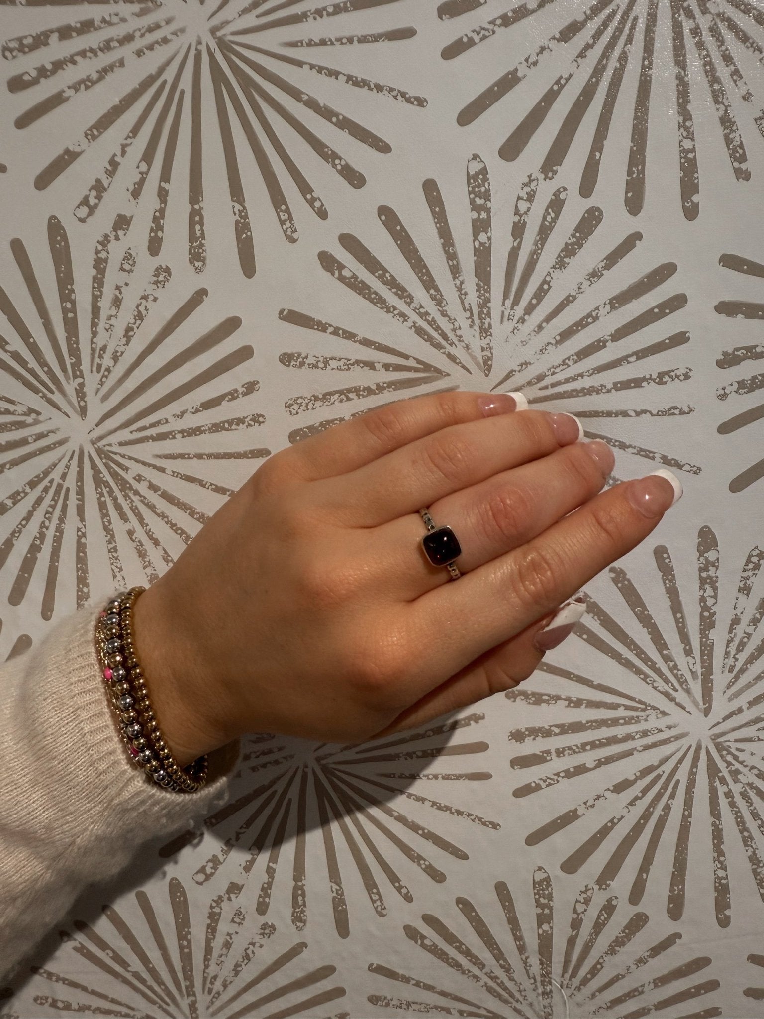 The square garnet cabochon is the heart of this design—its rich, translucent red evokes passion, vitality, and elegance. Long associated with love, energy, and protection, garnet has been cherished for centuries as a stone of grounding and renewal. In this ring, its bold hue stands out beautifully against the cool, luminous sheen of sterling silver, creating a contrast that feels both striking and harmonious. Whether worn as a personal talisman or a refined accessory, the garnet’s warmth draws attention and adds a touch of understated luxury to any look.