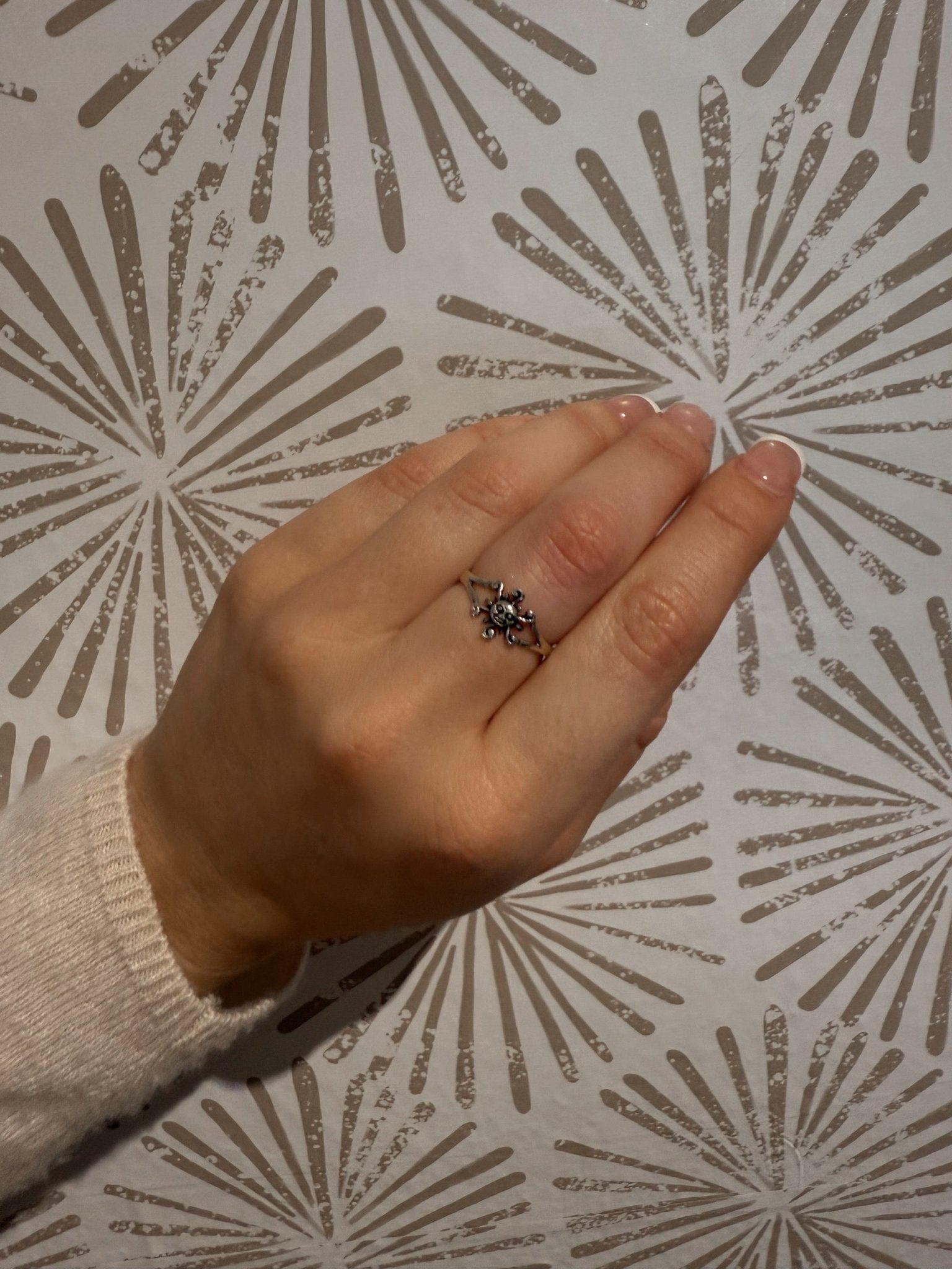 • Style: Artisan-inspired, symbolic, handcrafted lookThe artistry of the Swirly Ray Sun Face Ring lies in its intricate detail. Each swirling ray is individually sculpted, creating movement and texture that make the design come alive. The gentle curves of the rays flow outward from the serene expression of the sun, evoking warmth and vitality. The handcrafted quality gives this piece a sense of authenticity and soul—every curve, swirl, and engraving showcases the timeless beauty of artisan silverwork. Whether viewed up close or admired from afar, the ring’s radiant motif captures attention without being overpowering, making it perfect for daily wear.