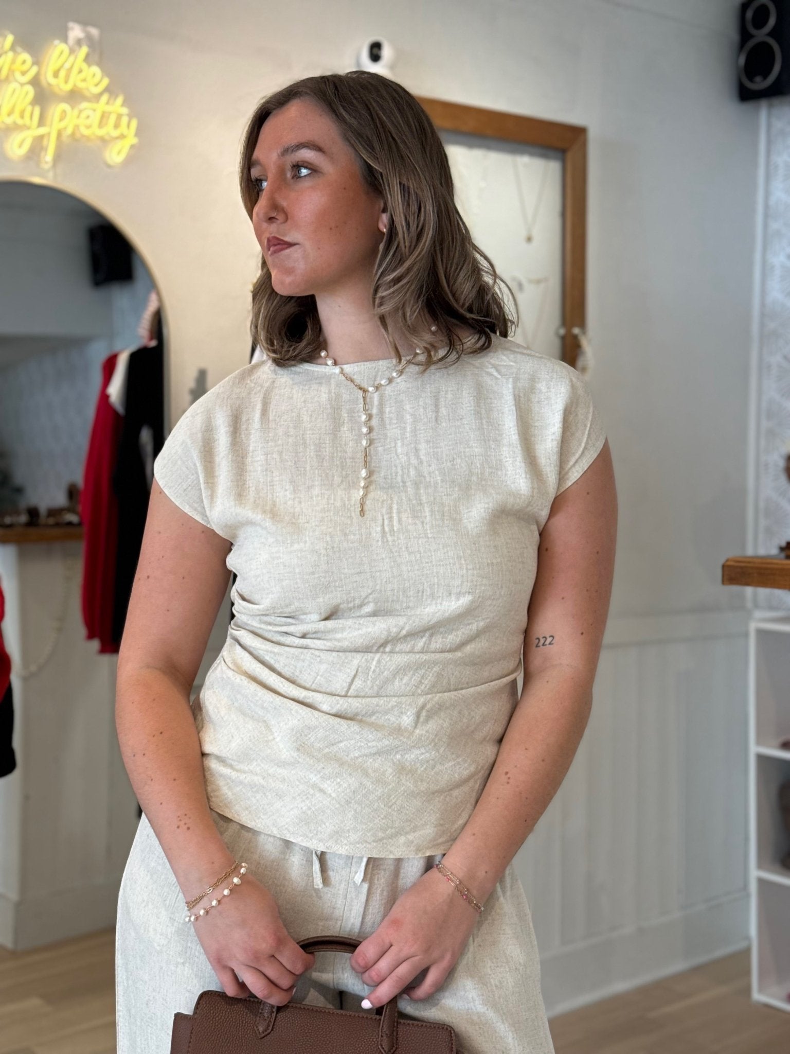 • Oatmeal-colored linen top