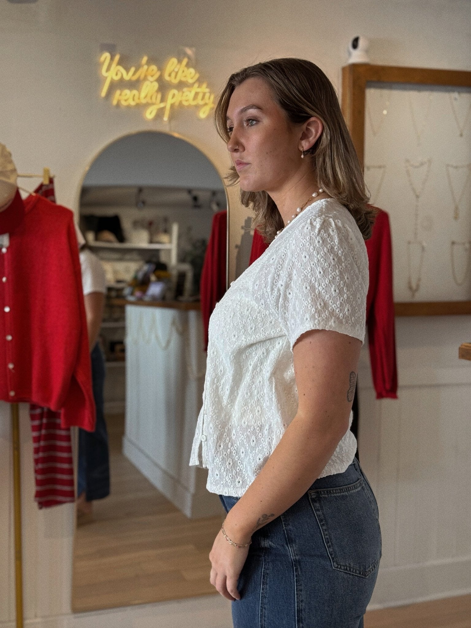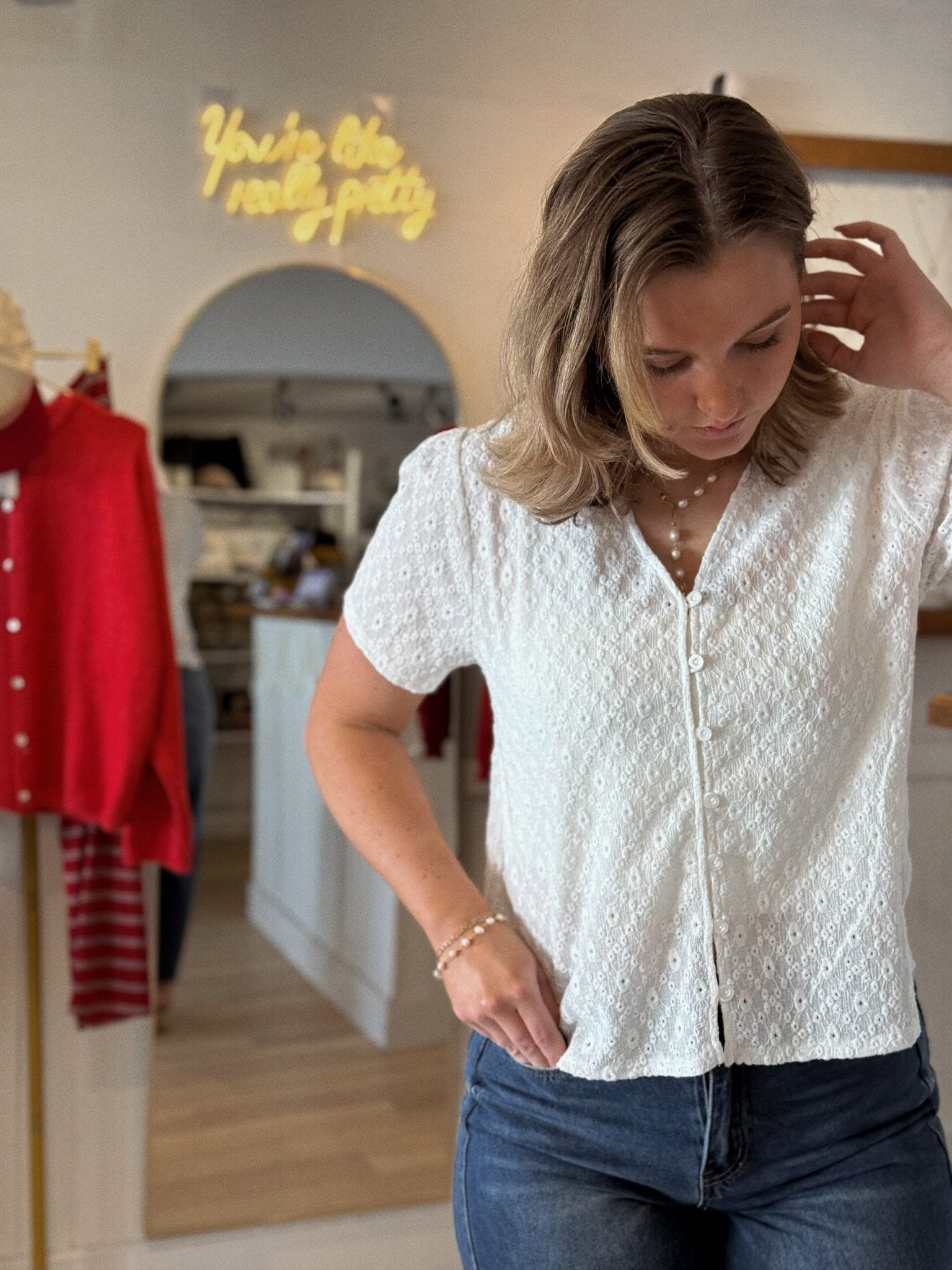 Fresh, feminine, and effortlessly timeless — the Meadows Top is the definition of soft sophistication. Designed in a crisp white hue with delicate floral lace detailing, this short sleeve button-up brings together classic charm and modern ease. It’s the kind of piece that feels light and graceful, yet incredibly wearable for everyday life.