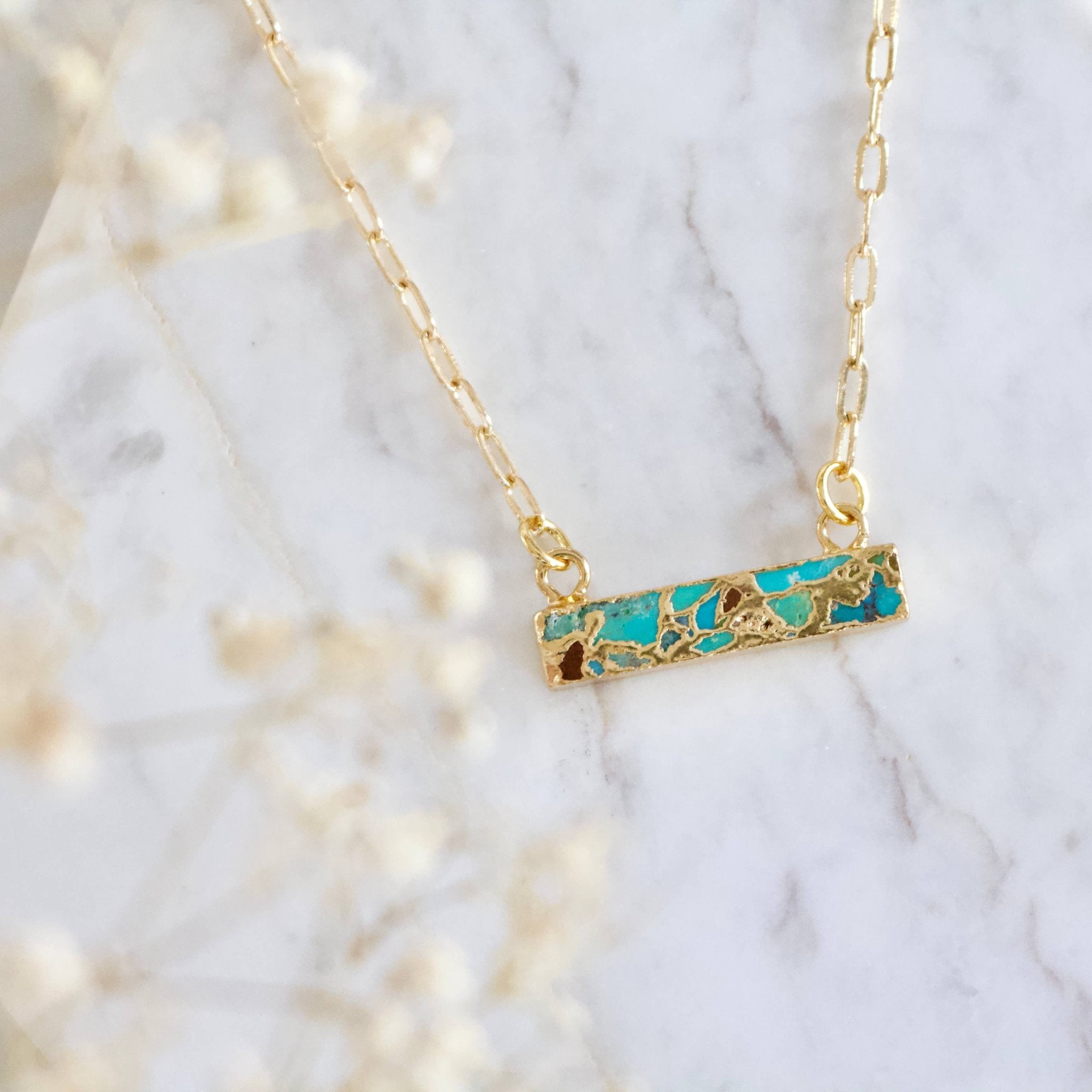 Details: • MATERIAL: 18K gold plated chain, copper turquoise stone bar • CHARM: 5x25mm • CHAIN LENGTH: 16" + 2" extender chain • CLASP STYLE: Lobster claw