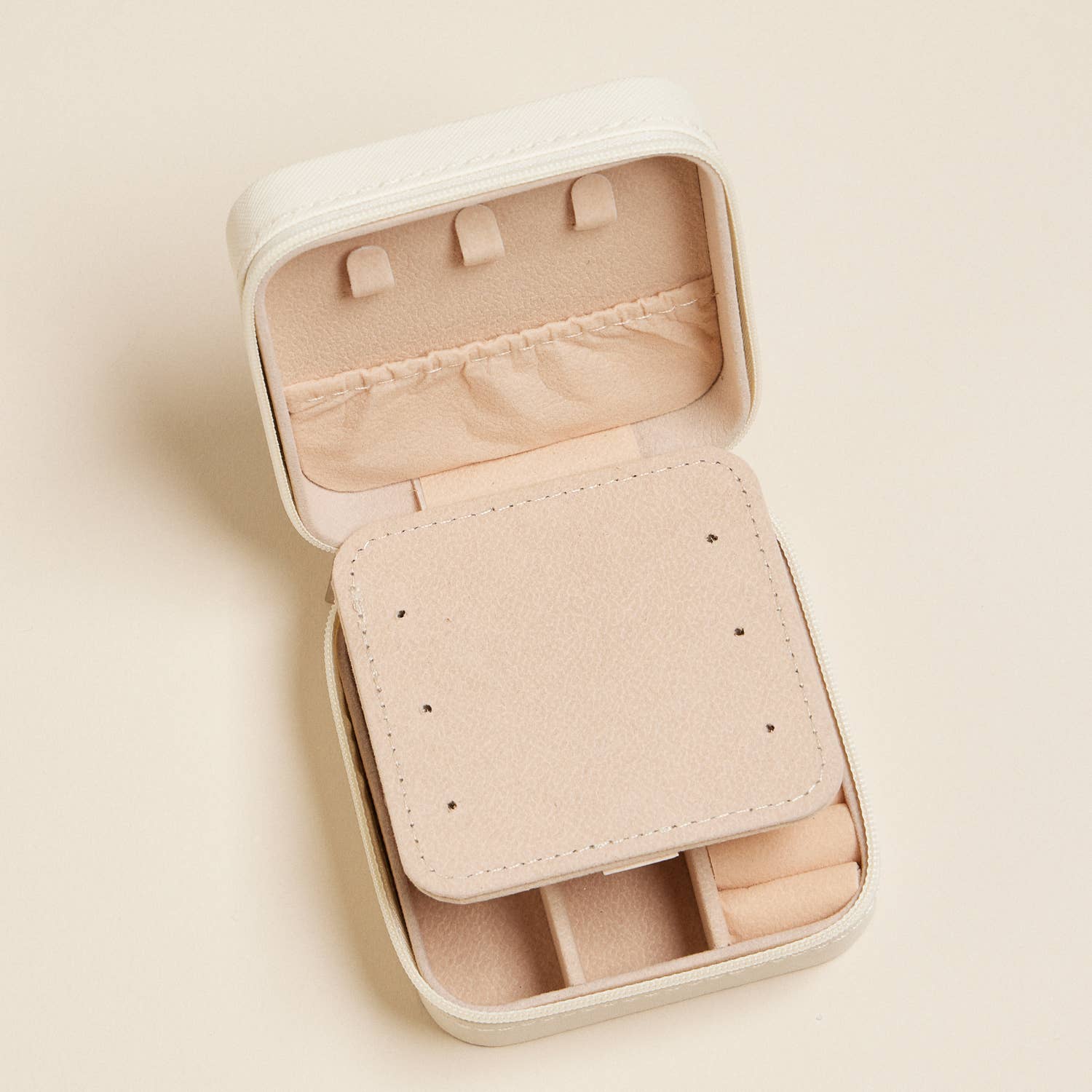 This Pink Daisy Print Jewelry Box is a stylish and functional travel accessory made from durable PVC material. Its compact, square design is perfect for on-the-go use, offering a convenient zipper closure for secure storage. Inside, it features multiple compartments for organizing your jewelry, a mirror for easy access and touch-ups, and a dedicated necklace hanging feature to prevent tangling. Ideal for keeping your precious pieces safe and organized while traveling, this jewelry box combines practicality with a charming floral aesthetic. Material: PVC 100% Size: 3.75" x 3.75"