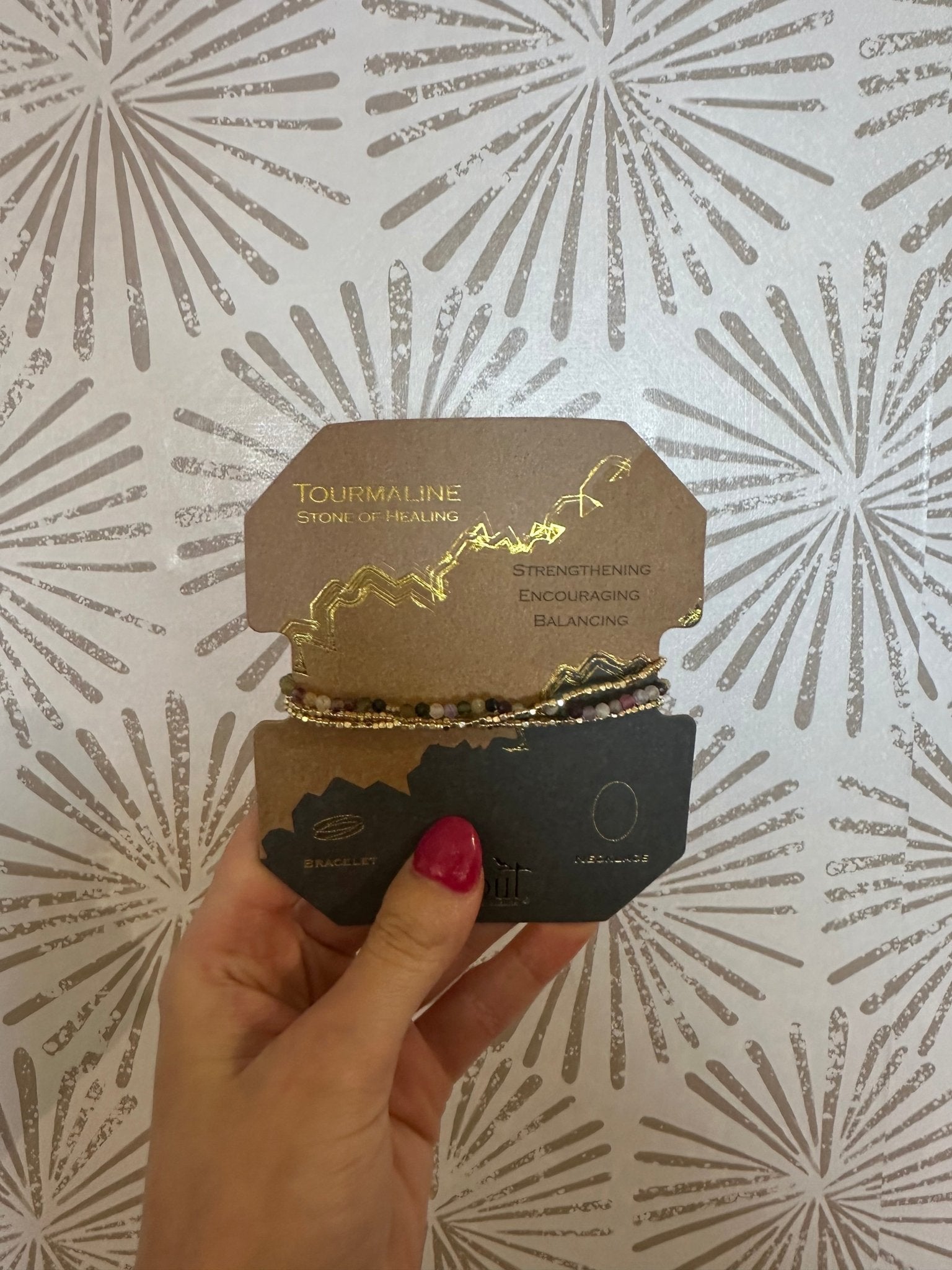 Bracelet becomes a necklace & Ta-Da! Faceted gemstones mix with tiny geometric metal beads to create a subtle and magical piece. Wraps as a bracelet 3 times or wear as a single strand necklace. • Materials: Semi precious gemstone beads, plated brass, stretch cord • Presented on cards that tell the meaning and properties of each stone.Tourmaline: Stone of • Healing. Strengthening, encouraging, balancing .