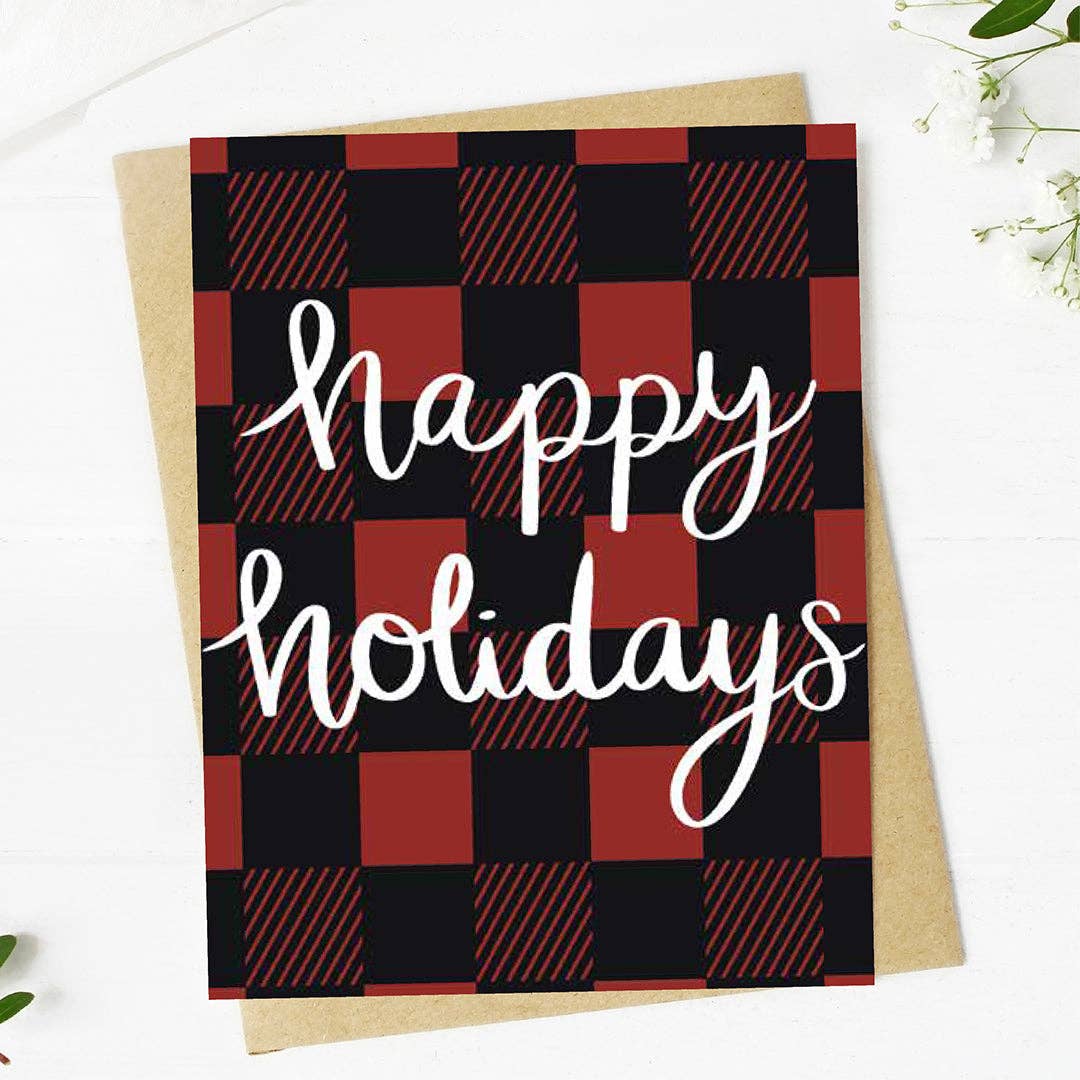 Spread holiday cheer in plaid with this ""happy holidays"" plaid greeting card. -A2 Size (4.25 x 5.5 inches folded). -Printed on premium 16pt thick cardstock with a matte finish. -Paired with a coordinated kraft or holiday color envelope. -BLANK INSIDE -Hand Drawn Categories: christmas, christmas cards, christmas decor, holiday cards, holiday season, winter, seasonal cards, greeting cards, cards, cute cards, funny cards, christmas ornaments, holiday ornaments, holiday decorations, christmas 2024, stocking stuffers, holiday, cards, christmas gifts.