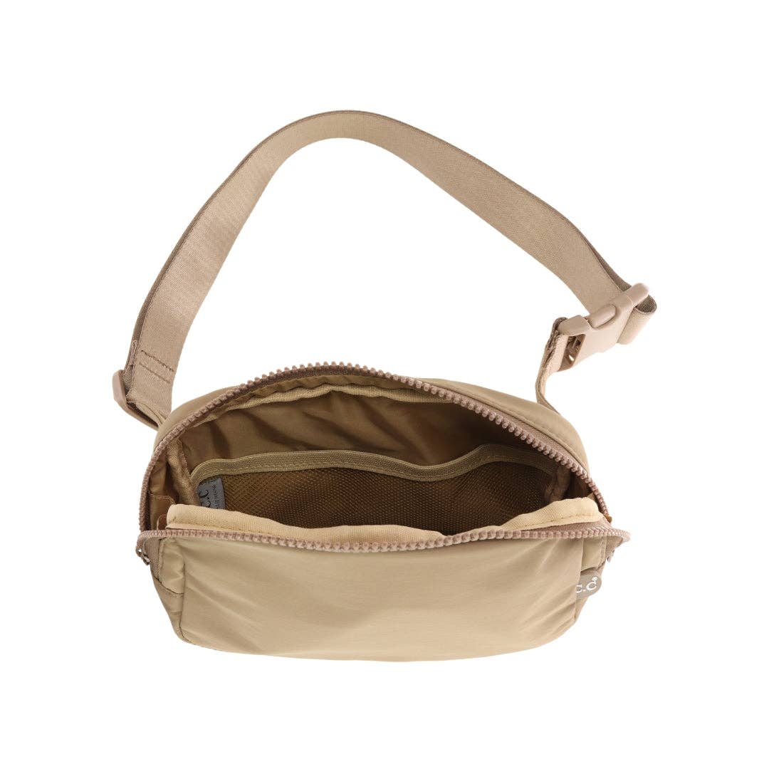 This allows you to still have the ease of hands-free, but with a little more space. Great for travel! Spot Clean only. Measures: 10 in. x 3 in. x 7 in. Strap: 45 in.